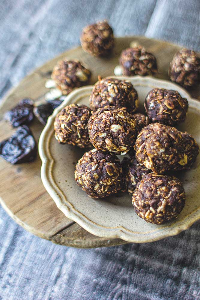 To make energy balls: In mixing bowl, stir oats, coconut, nut butter, pecan meal, prune puree, cocoa powder and vanilla until completely combined.